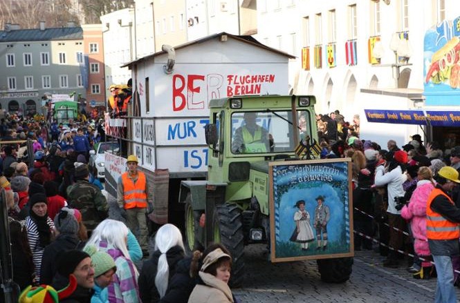 Der Faschingszug der Inntalia zog am gestrigen Sonntagnachmittag viele Schaulustige in die Mühldorfer Altstadt. Im Sonnenschein drängten sie sich in mehreren Reihen und sahen 41 Wagen, Fuß- und Musikgruppen, die vor allem lokale Themen aufnahmen, aber auch die große Politik nicht links liegen ließen.